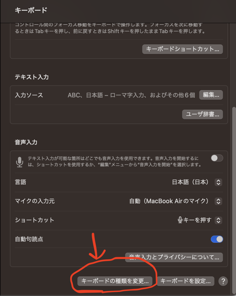 ①システム環境設定→キーボードの種類を変更を選択