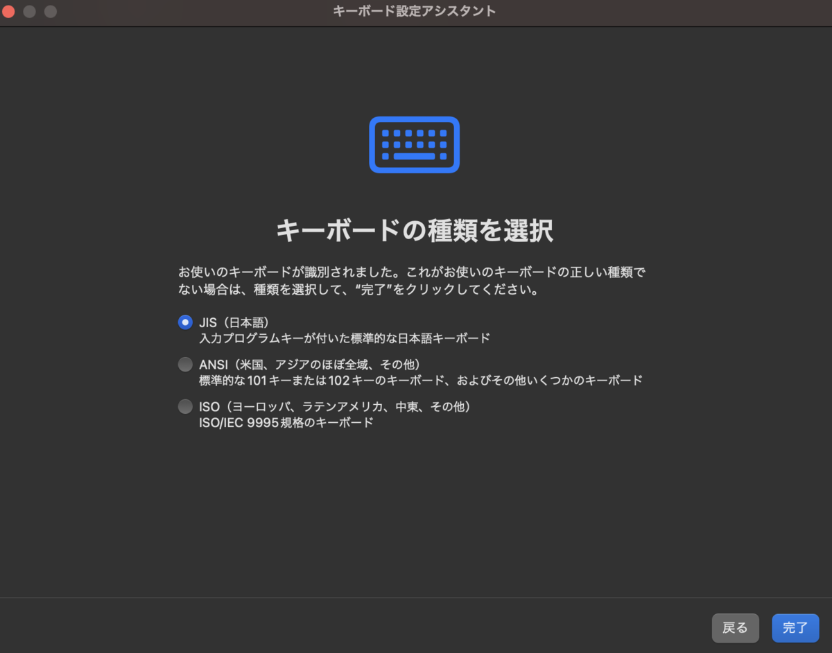 ④JIS(日本語)を選択し、完了ボタンを押します。